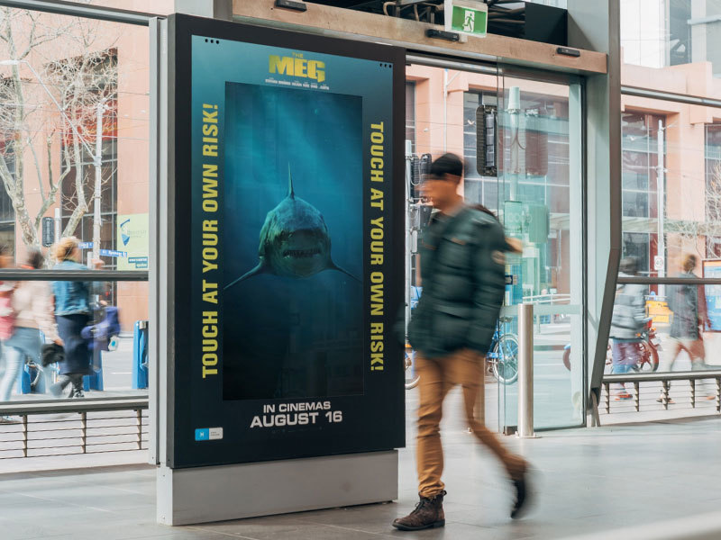 Sobald der Touchscreen aktiviert wurde, tauchte ein riesiger Hai aus dem trüben Wasser auf und "attackierte" den LCD-Bildschirm, welcher dramatisch zersplitterte und den Passanten einen Schreck einjagte.