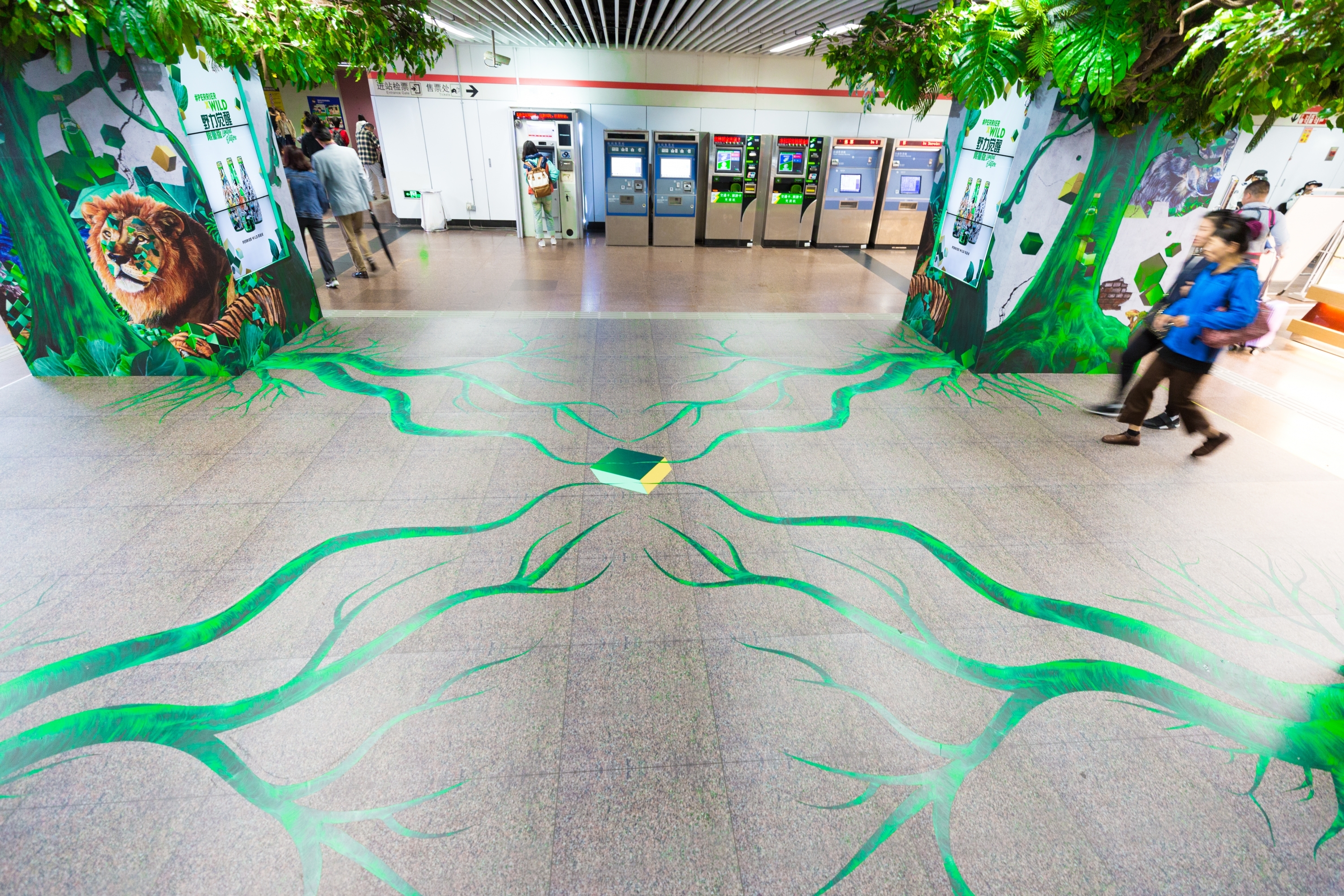 Für einen Monat wurde die Haltestelle "South Huangpi Road" in der Metro von Shanghai für Perrier umgestaltet. Künstliche Pflanzen, leuchtende Bodenfolien und dekorierte Säulen verwandelten die Station in einen Dschungel - inklusive Tiergeräuschen aus integrierten Lautsprechern.