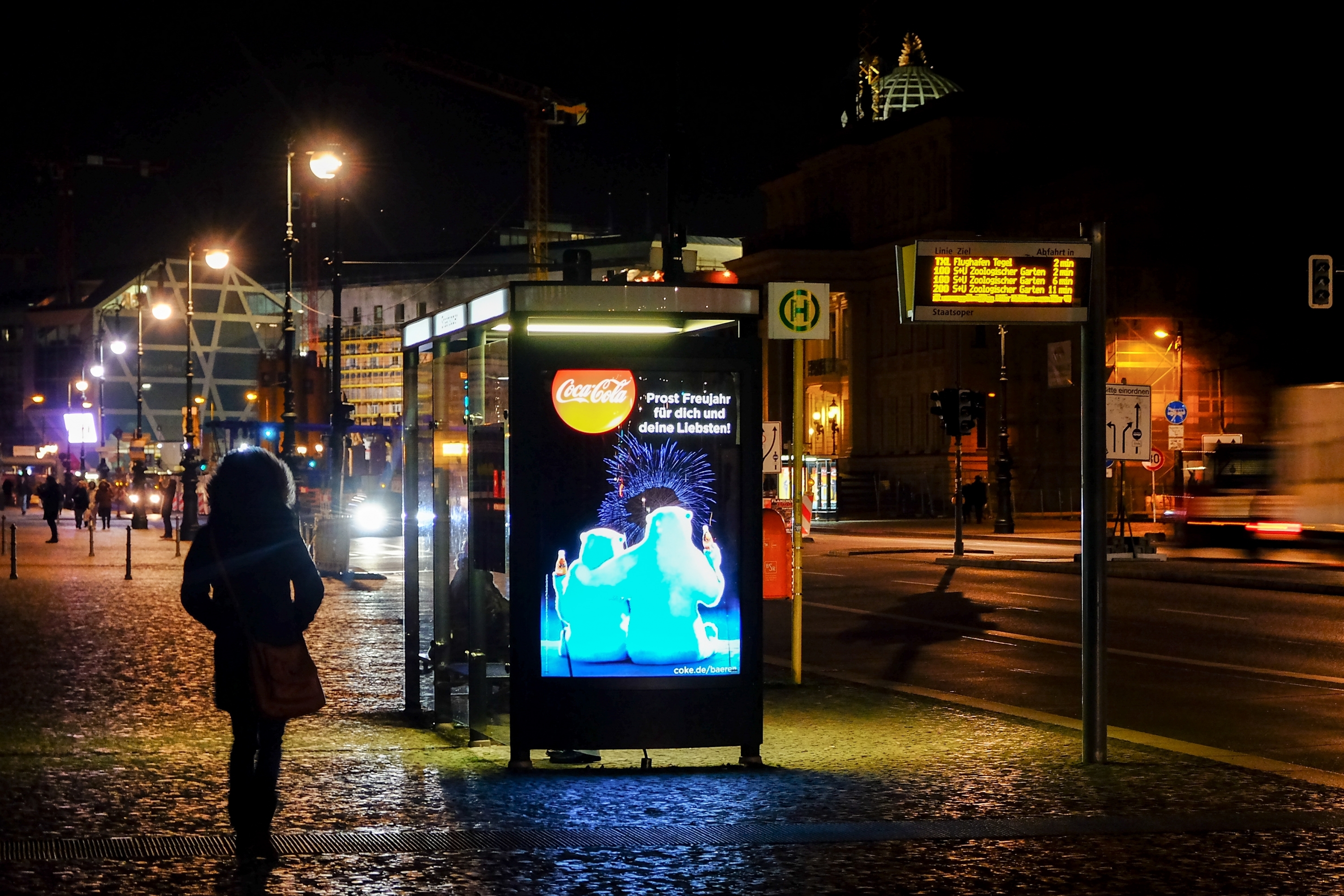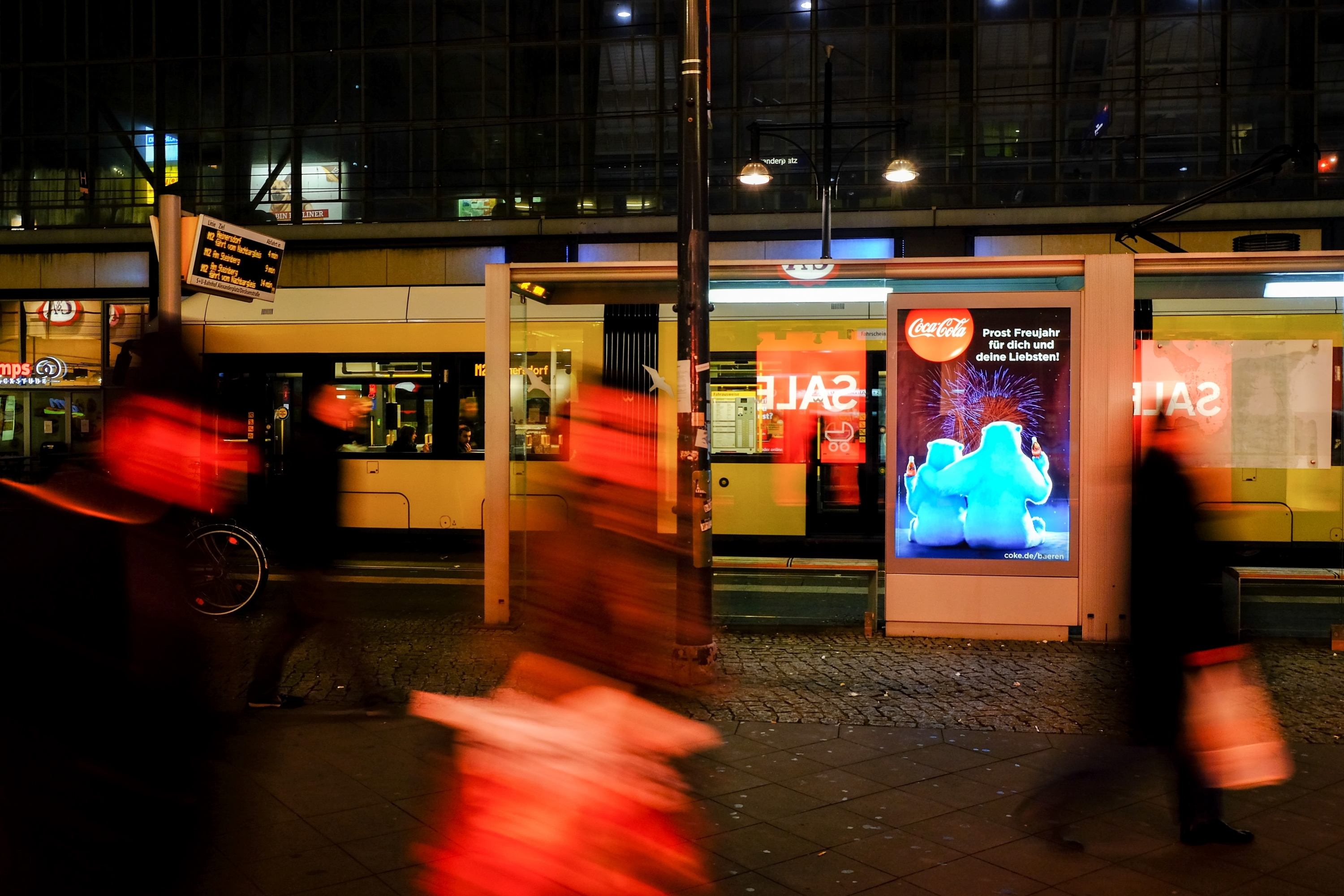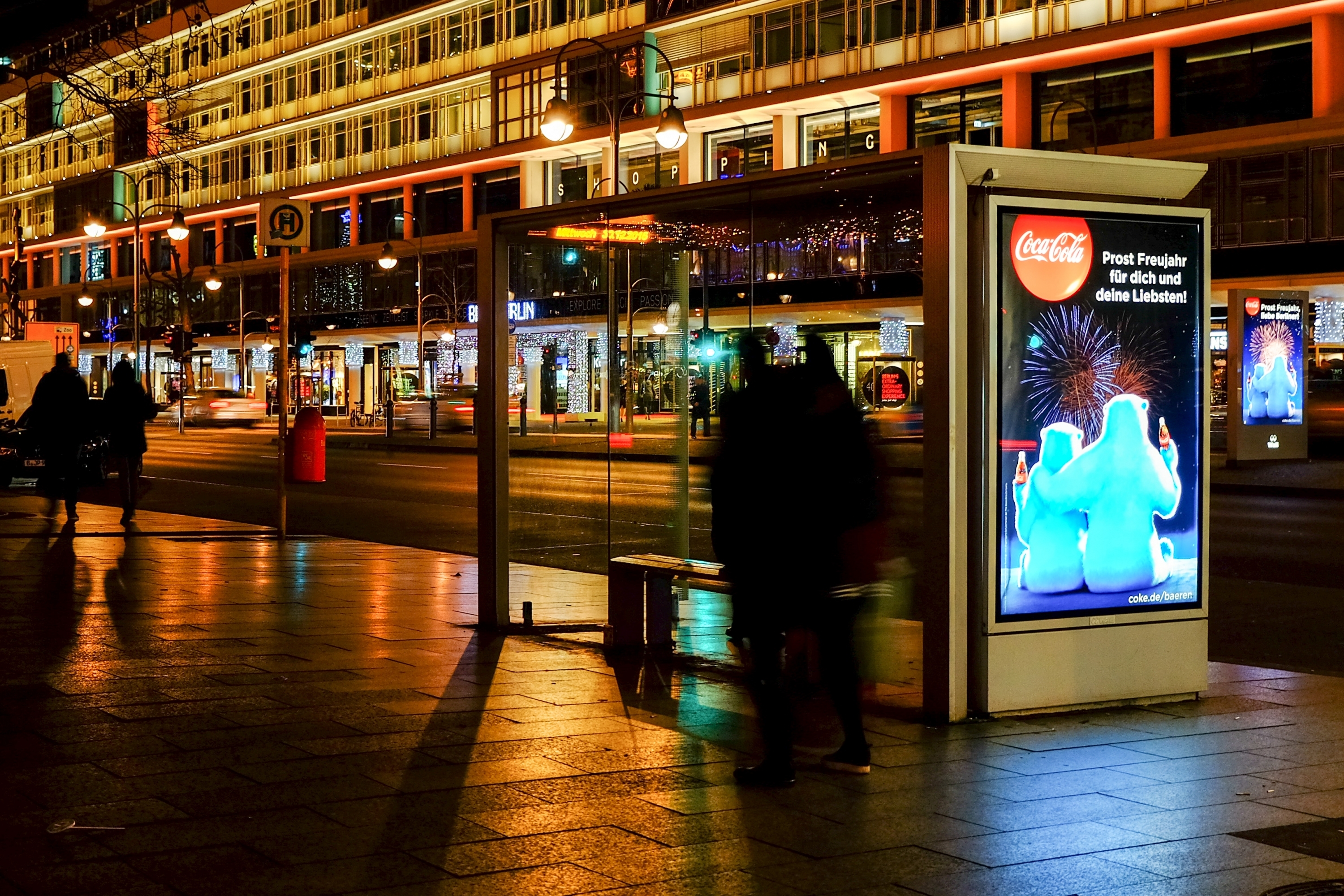Illuminationsposter. Coca Cola setzte in einigen Städten Plakate mit Licht-Anmiation ein. Die Coke Eisbären stimmten so bunt aufs neue Jahr ein.