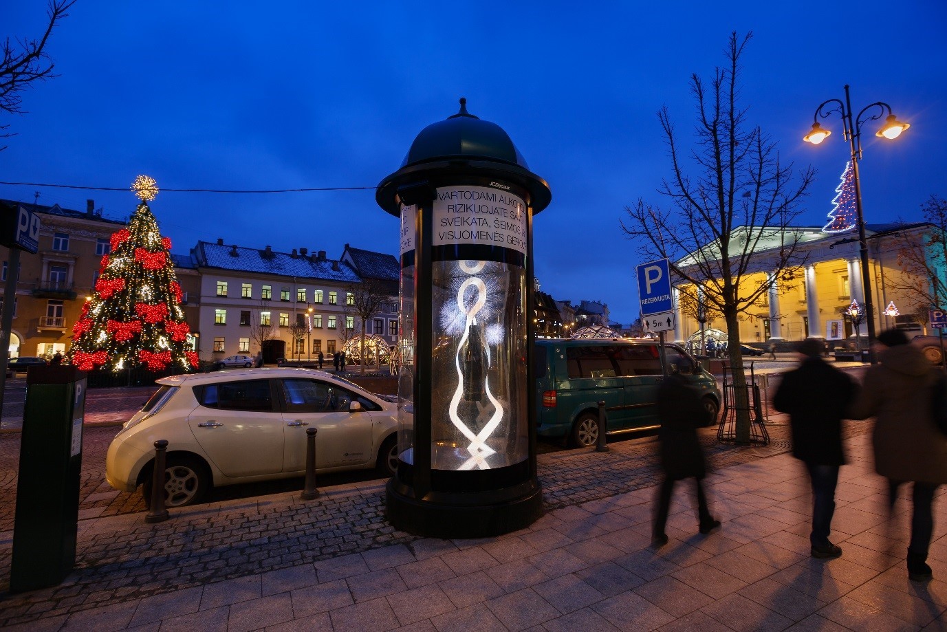 Die Kampagne für Freixenet in Vilnius kombinierte Bildschirme und Spiegel so geschickt, dass der Eindruck einer schwebenden Projektion innerhalb einer Säule entstand.