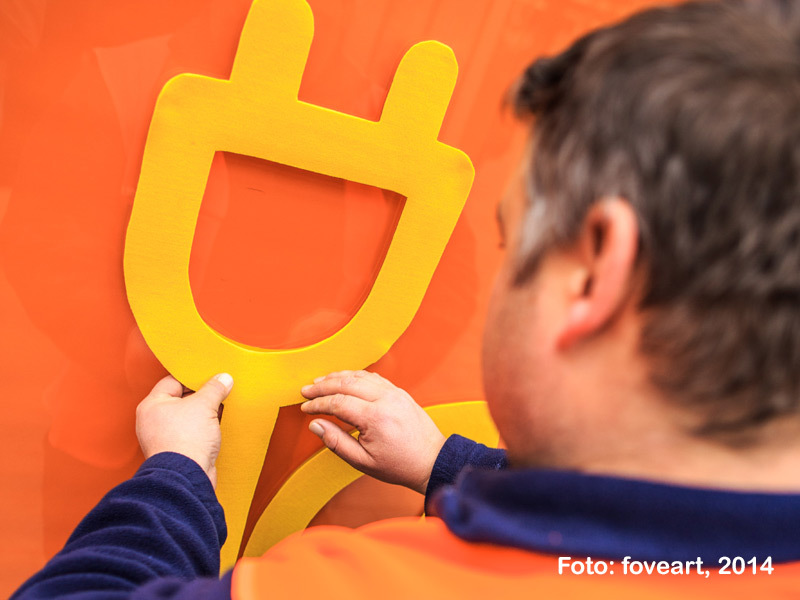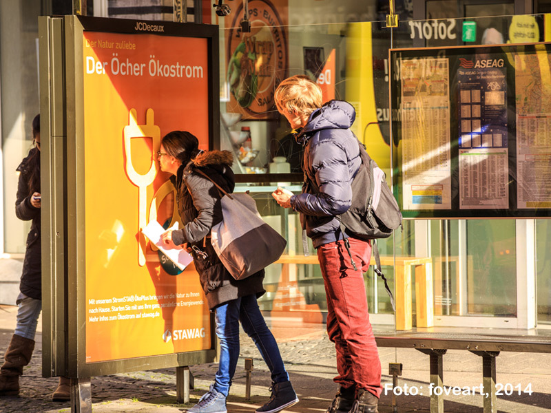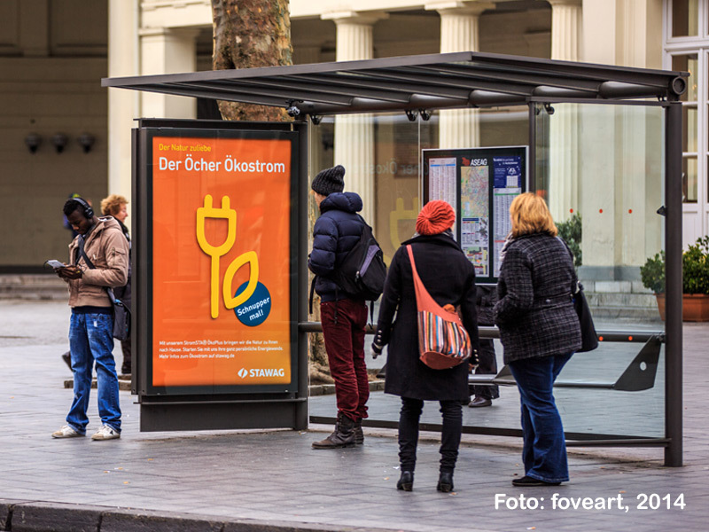 Vitrinenbeklebung. Passanten und Fahrgäste konnten den Natur- bzw. Ökostrom der Stadtwerke Aachen AG buchstäblich riechen. Hierzu wurden parfümierte Filzblumen an insgesamt elf Werbevitrinen angebracht.