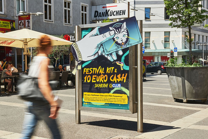 Eine überdimensionale Hand mit einer Cashless Card ragte über das City Light hinaus. Highlight: An einem der City Light Standorte leuchteten Scheinwerferaus den Augen der "Laser Cat", welche im Suchmodus über den Boden streiften und auf dem dort angebrachten Raiffeisen Club-Logo zum Stehen kamen.