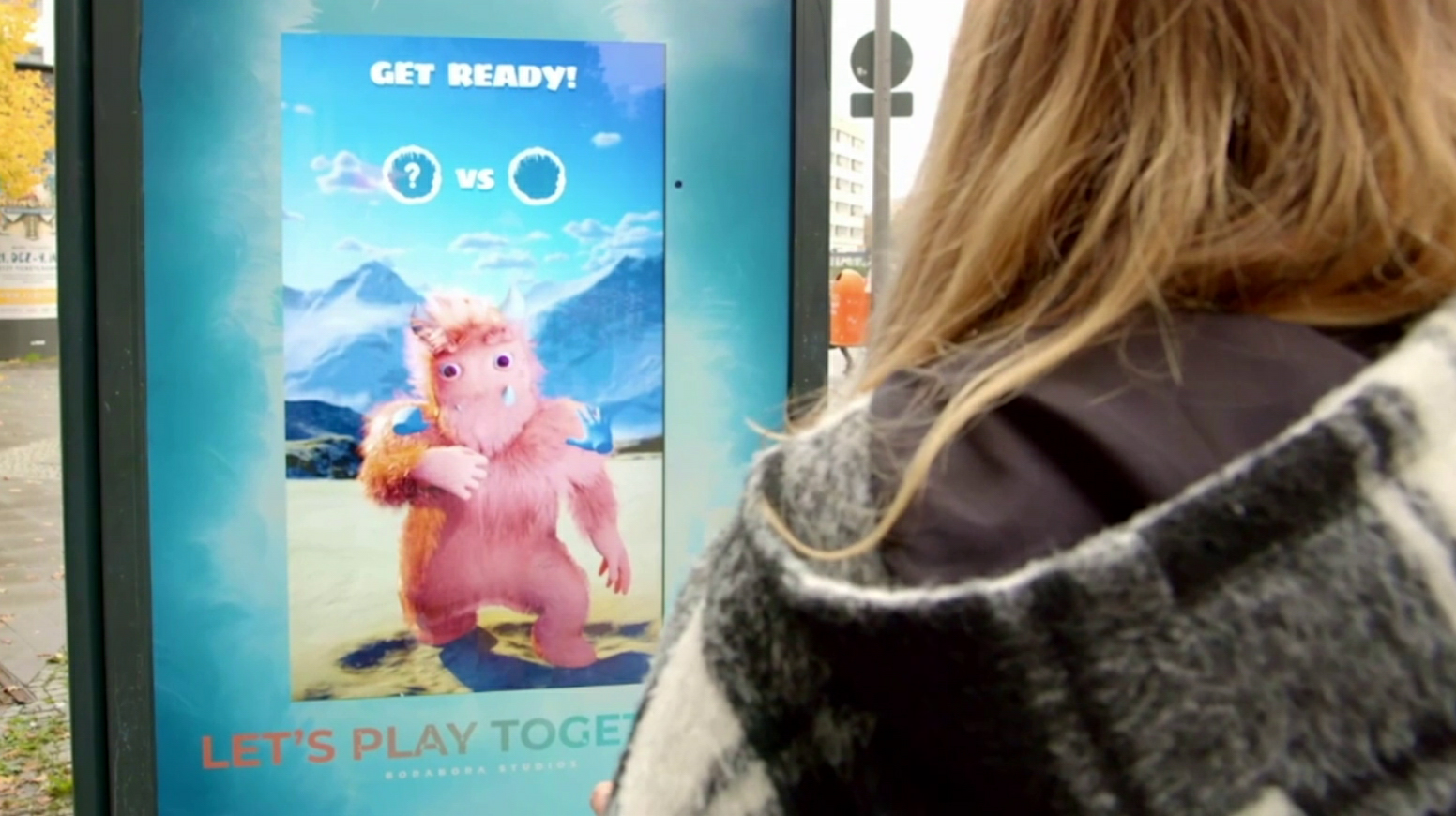 Während der Wartezeit auf den nächsten Bus konnte man via eines Kinect Motion Sensors gegen den 3D Charakter BOBA im Stein-Papier-Schere Spiel antreten. Die Handgesten der Teilnehmer wurden in Echtzeit von Tracking-Sensoren erkannt, und BOBA reagierte entsprechend.