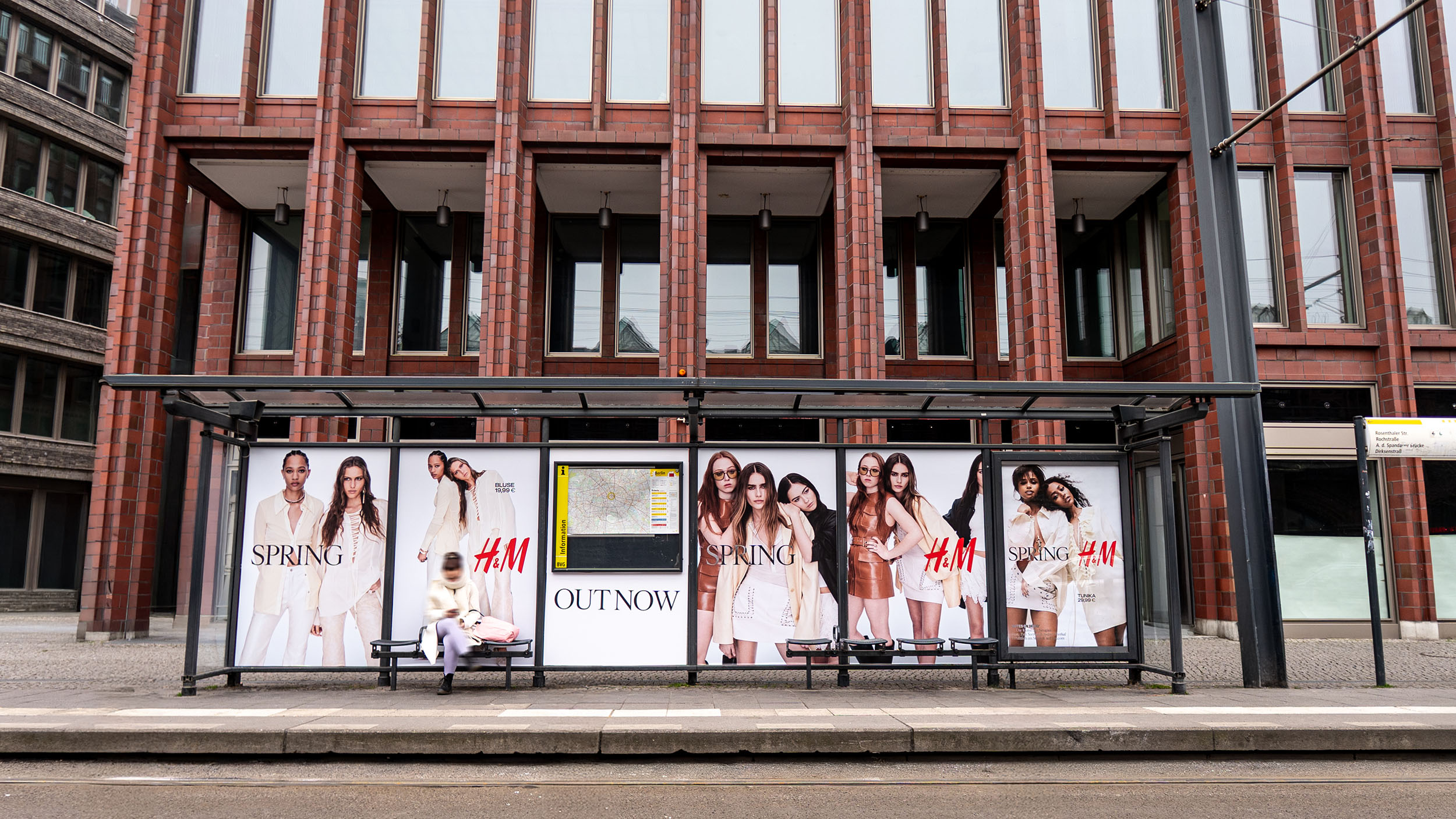 Ein auffälliges Wartehallenbranding an vier Berliner Wartehallen gibt einen Ausblick auf die Frühjahrskollektion 2025 von H&M.