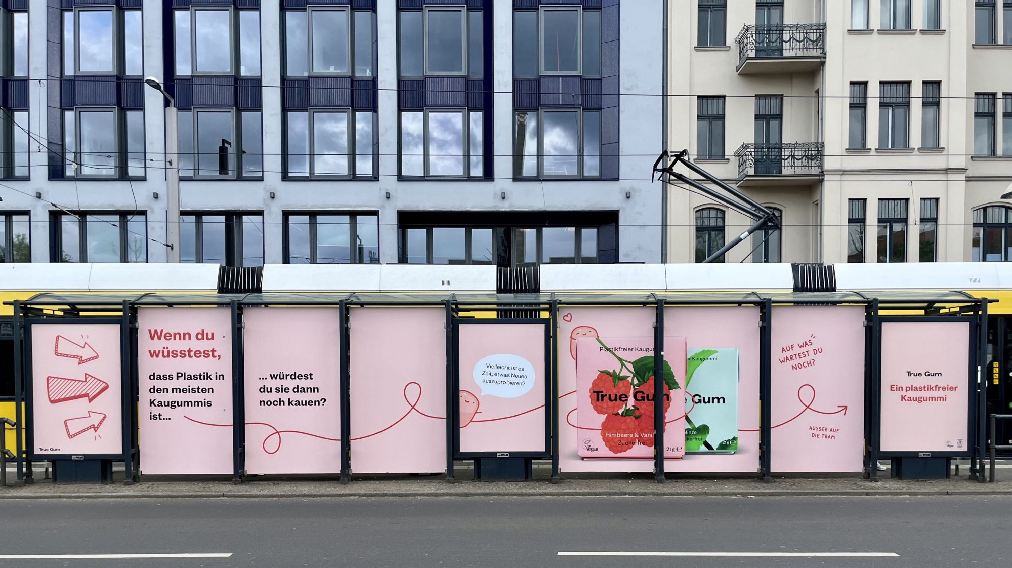 In Zusammenarbeit mit WallDecaux realisierte True Gum eine Kampagne auf rund 750 City Light Postern in Berlin, Deutschland. Das Highlight für alle Kaugummi-Fans war der bunt verpackte Fahrgastunterstand an der Straßenbahnhaltestelle Invalidenpark mit integriertem Kaugummi-Spender. Rund 3.000 der plastikfreien Gum Samples fanden innerhalb von einer Woche neue Fans in Berlin.