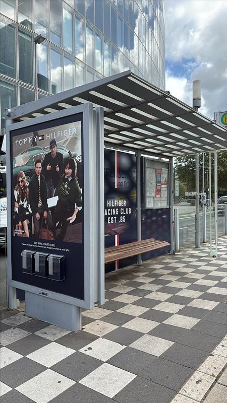 Eine gebrandete Wartehalle in Düsseldorf machte Passanten auf die Herbst-/Winterkollektion von Tommy Hilfiger neugierig. Ein weiteres Highlight war ein Prospektspender, aus welchem die Wartenden Karten entnehmen konnten. Mit diesen konnten Sie sich Rabatte im Tommy Hilfiger-Store sichern und an einem Gewinnspiel teilnehmen.