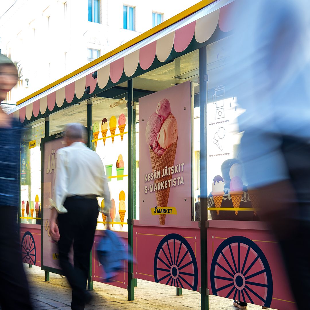 Das Wartehallenbranding für S-Market in Helsinki verwandelte die Haltestelle optisch in einen beeindruckenden Eiskaffee-Kiosk. Diese kreative Maßnahme brachte sommerliche Freude in die Stadt und bot den Passanten ein erfrischendes und außergewöhnliches Erlebnis.