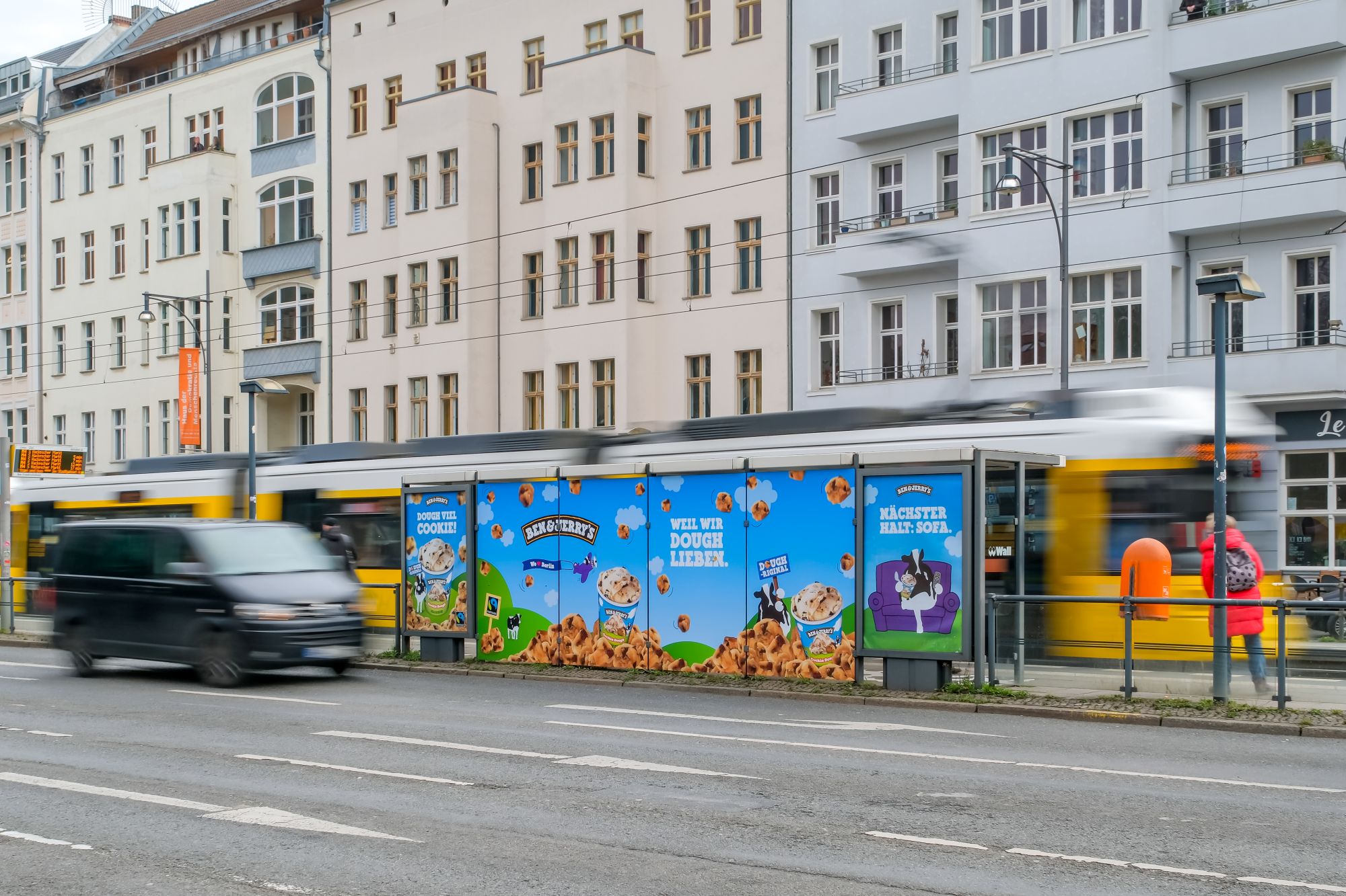 Die neue Kampagne für Ben and Jerry's Eiscreme in der Geschmacksrichtung Cookie Dough. Motiv und Kuhflecken Floor Branding sorgten in Berlin, Bremen und Düsseldorf für Aufmerksamkeit.